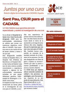En el boletín de enero de 2026 compartimos noticias muy relevantes para la comunidad CADASIL: la designación del Hospital de la Santa Creu i Sant Pau como CSUR, un hito histórico que mejora la atención especializada y refuerza la investigación; la definición del Plan Estratégico ACE 2026-2030; un balance de la III Jornada CADASIL; nuevas acciones de visibilidad impulsadas desde los ayuntamientos; el inicio de la organización territorial en Canarias y, cómo no, una nota de alegría con la pedrea de la Lotería de Navidad.